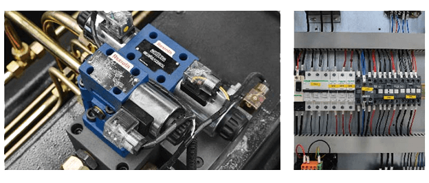 Наши листогибы используют интегрированную гидравлическую систему управления BOSCH- REXROTН, с уменьшенным количеством соединений труб, что делает данную систему более надёжной и более лёгкой в эксплуатации. Электрокомрненты применяемые в оборудовании - Schneider.